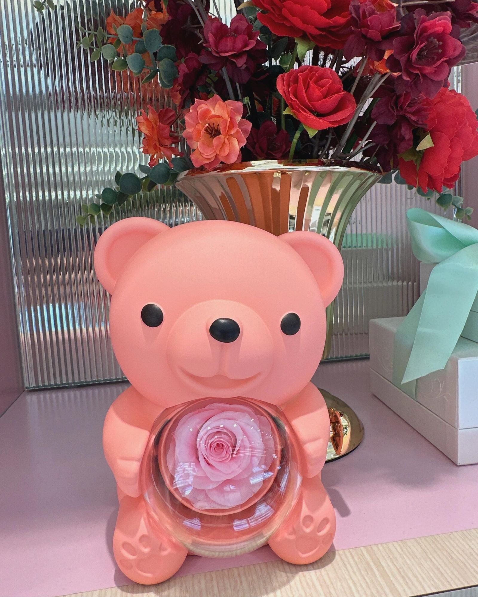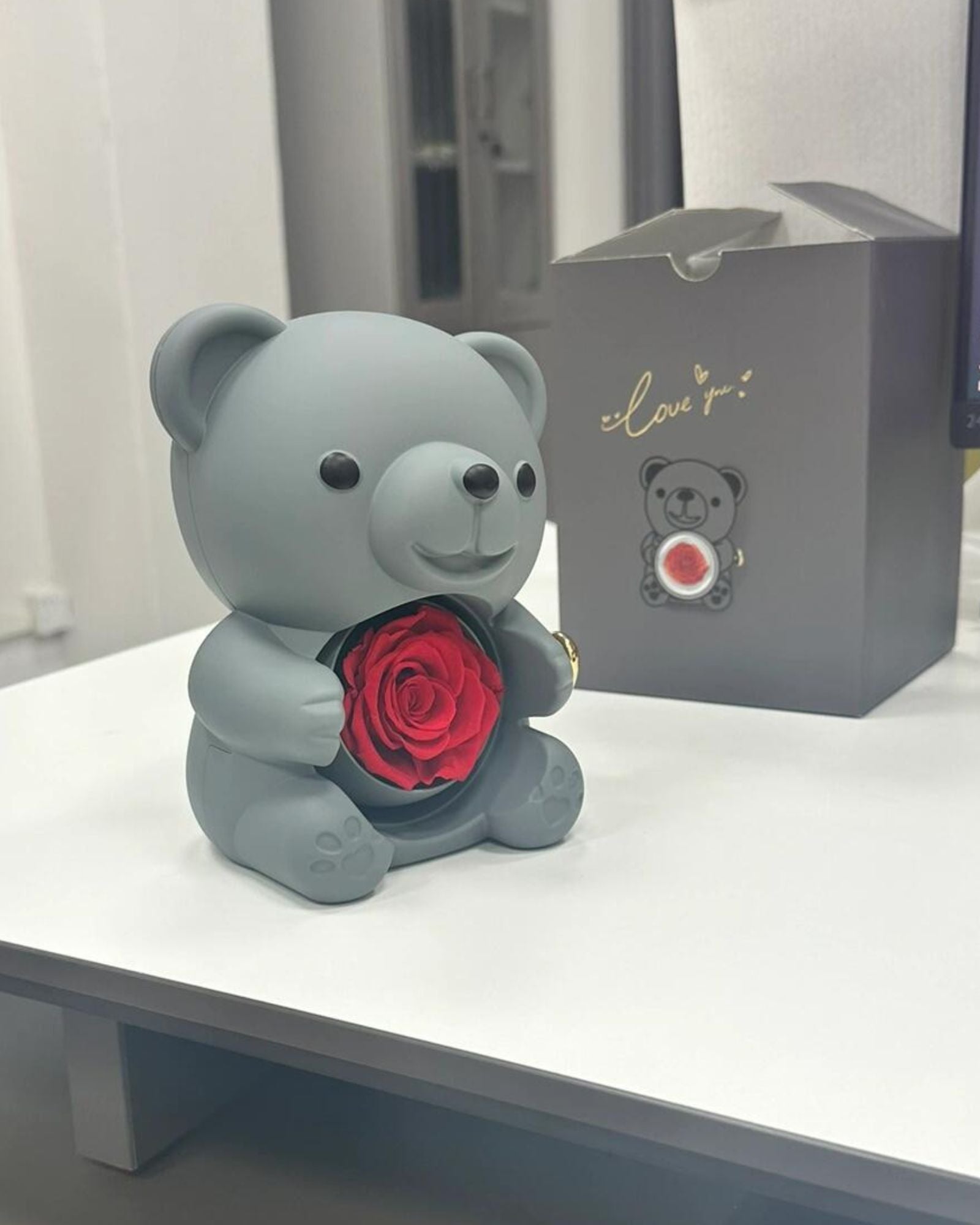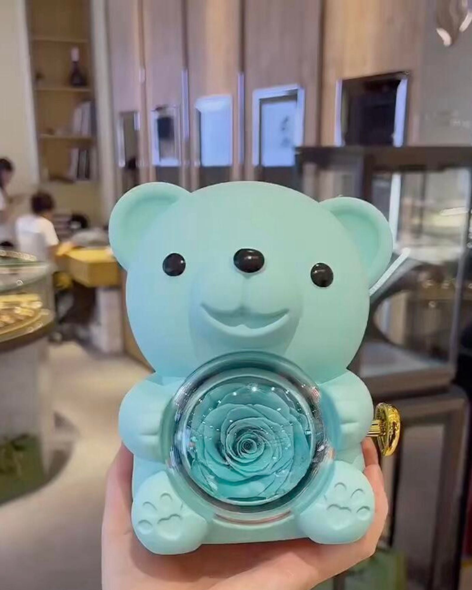 "Exceeded all expectations! Ordered the pastel blue bear with white rose and rose gold necklace for my wife's birthday. The clear display window shows off the rose perfectly, and the rotating mechanism is smooth. Three months later, the rose still looks as fresh as day one. Highly recommend!"