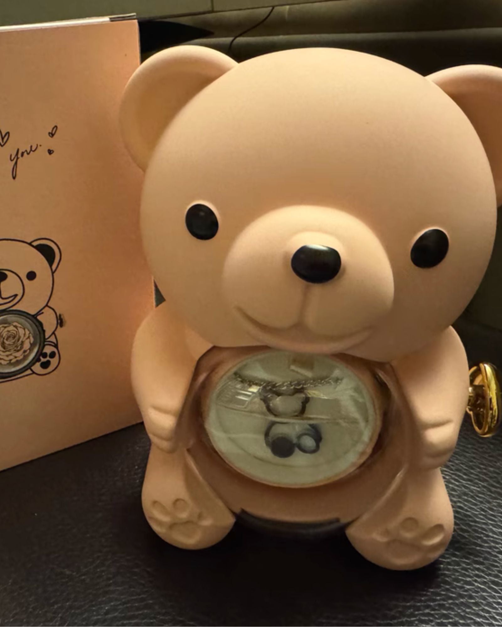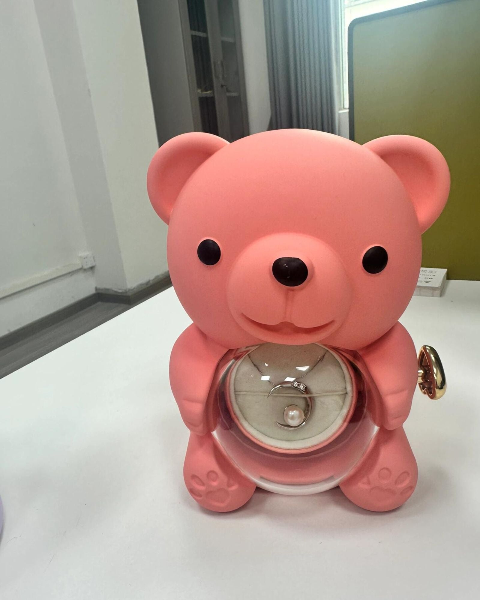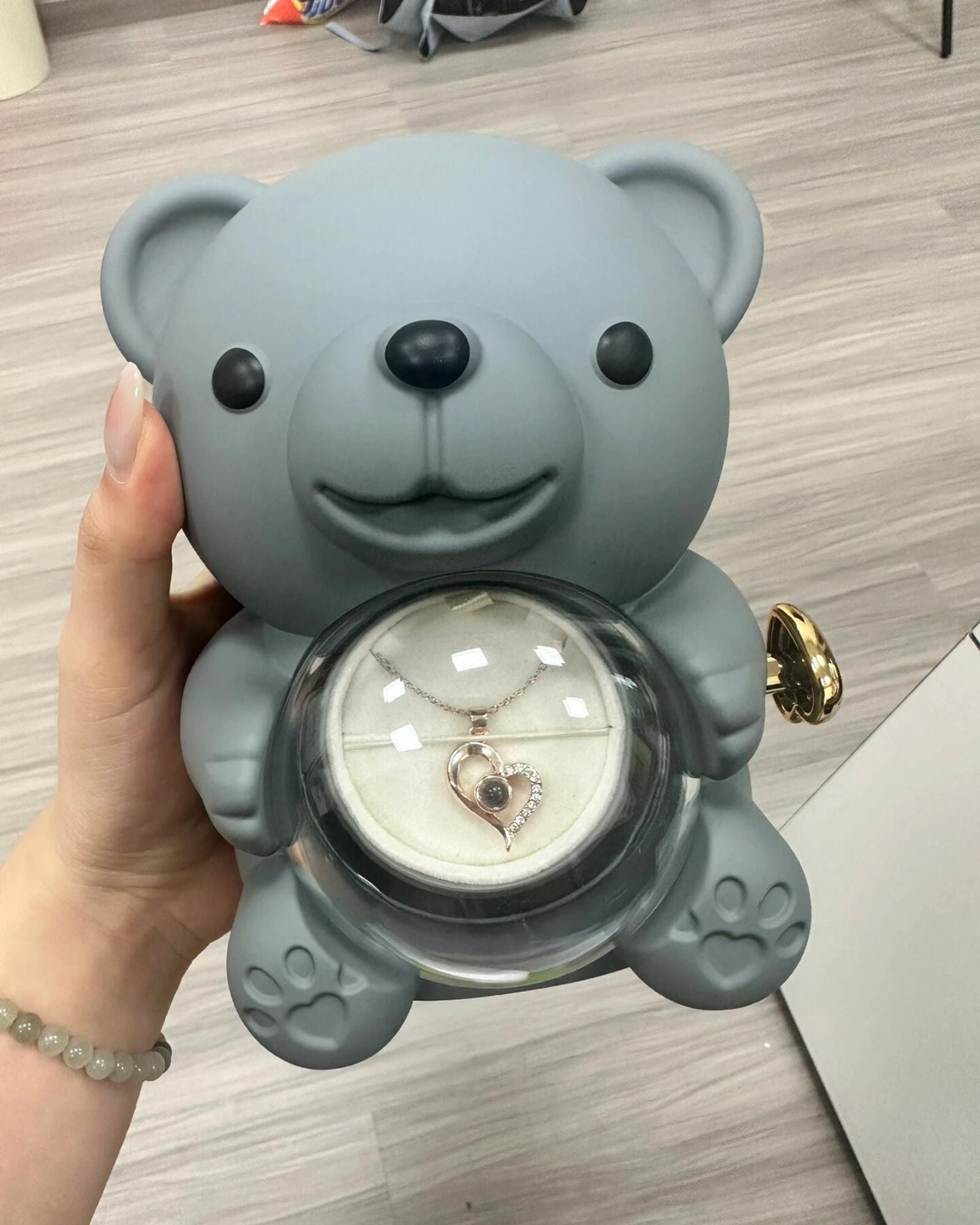 "The most magical gift I've ever received! When my boyfriend gave me this bear, I thought it was just a cute plush with a rose. But when he showed me how to turn the heart knob and the necklace appeared, I burst into tears. The engraved message on the hearts made it even more special. A year later, both the rose and necklace still look perfect."